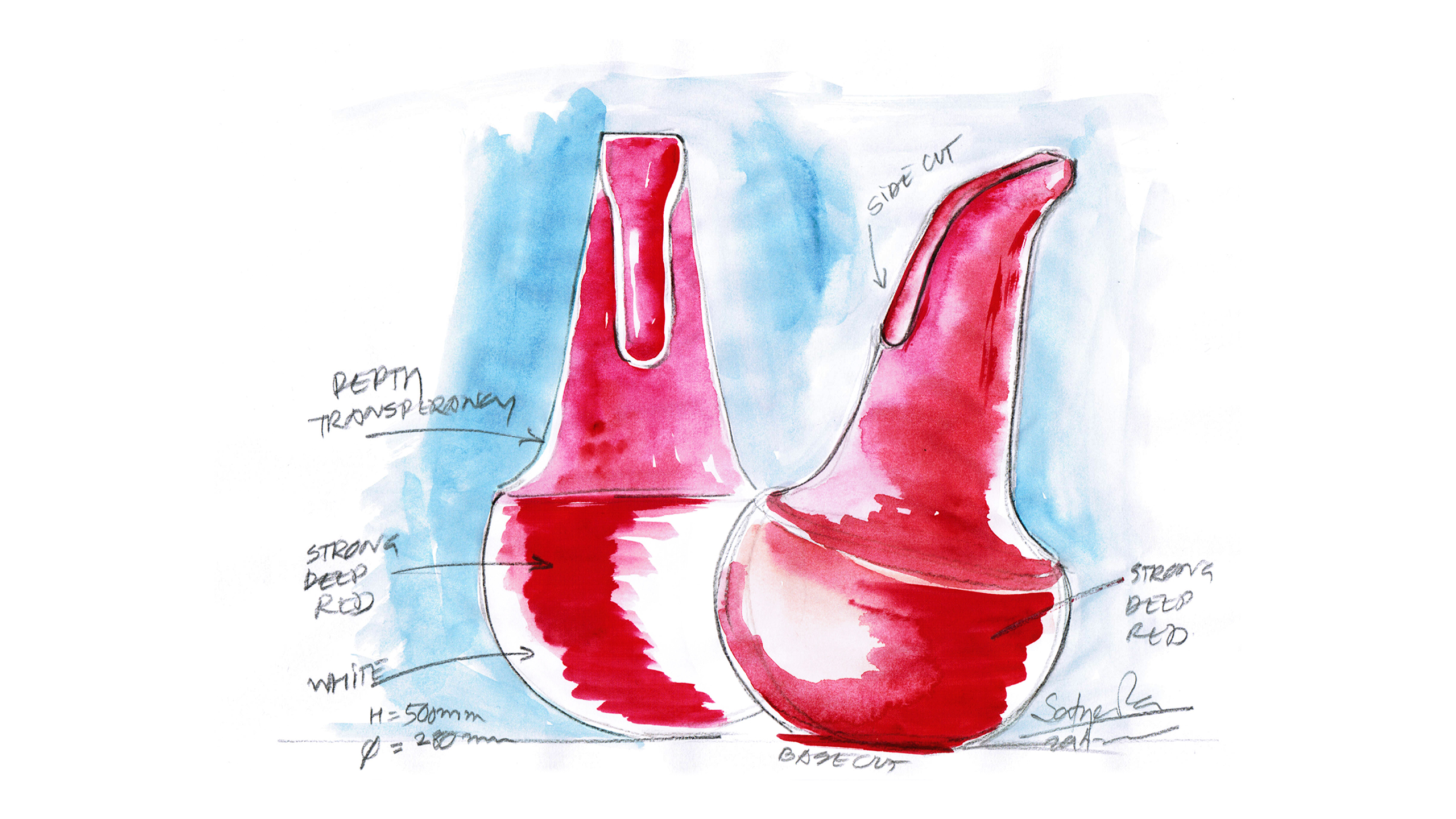 The Salaka is made of two layers of Murano glass, a fresh coloured glass outside and a white opaque inside give depth to the material. The vase with its large bowl-like base is a generous form that suggests ‘giving’. The base flows into a defined sharp edge that leads into a long neck. The vertical cut in the neck is a sensual feature that lends itself to arranging flowers in various manners – playing with its body as a frame and stage like a caress underlining the gesture of ‘giving’.